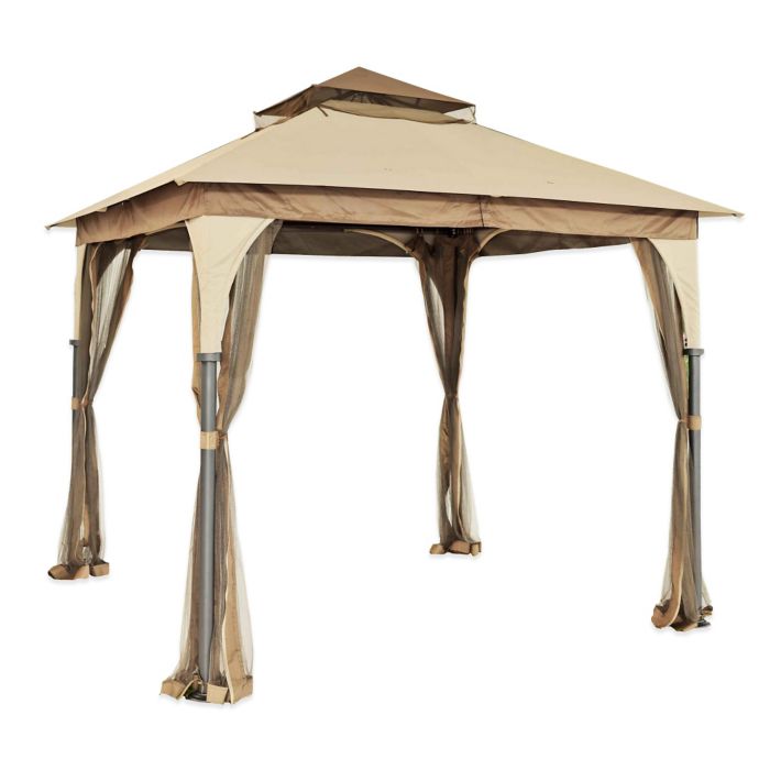 Sunjoy tan and brown metal square screened semi permanent gazebo exterior.